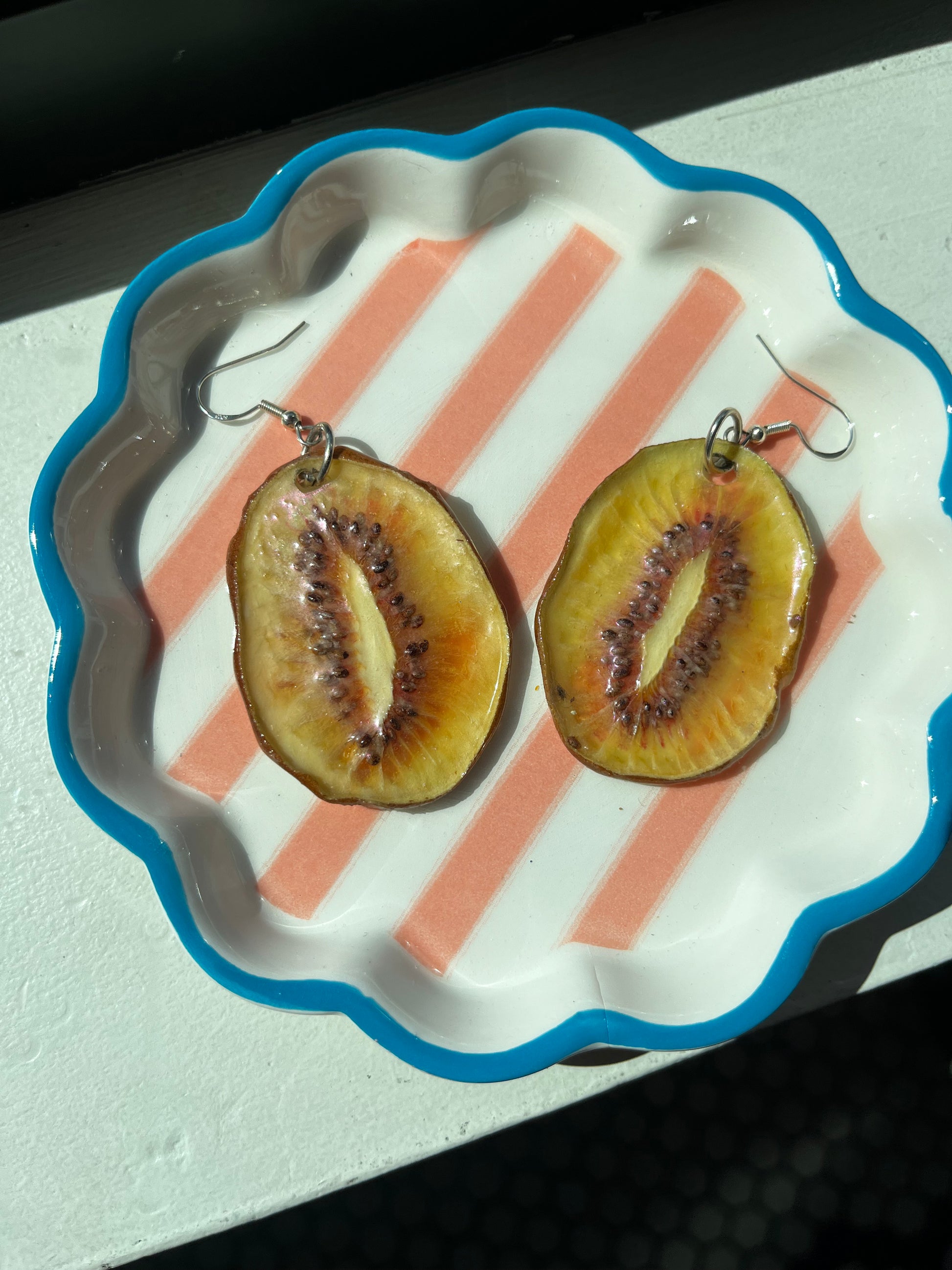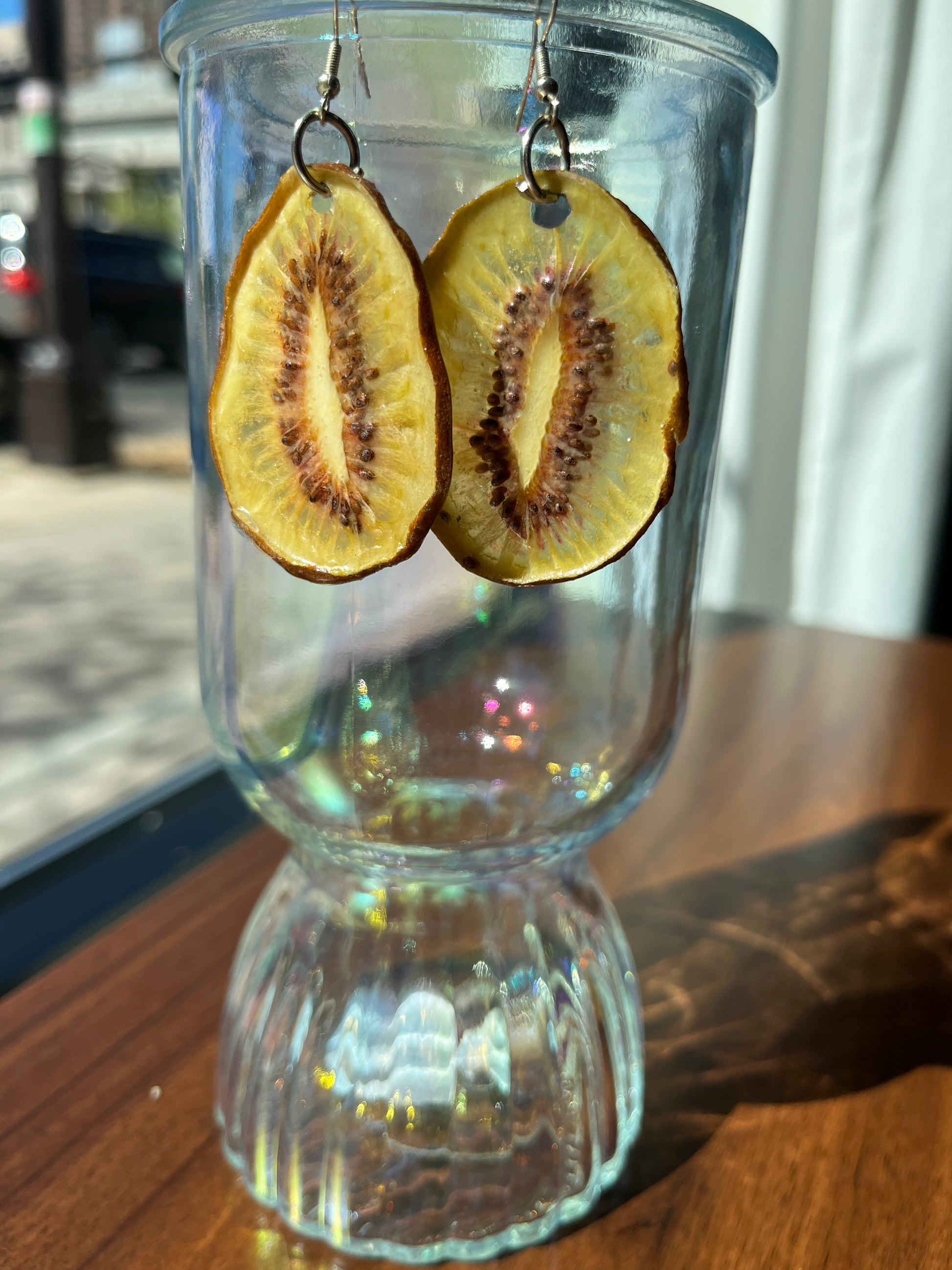 These quirky earrings are made with real dehydrated kiwi slices encased in resin. (No kiwis were harmed in the making of these earrings =])